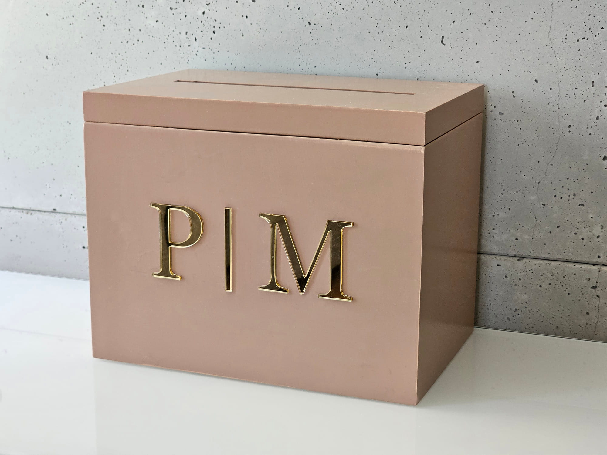 Beżowa skrzynka na koperty z personalizowanymi złotymi inicjałami z pleksi