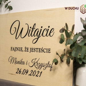 Tablica powitalna może być wykorzystana do powitania gości, jak również jako dekoracyjny element na sali weselnej. Dzięki niemu można nadać aranżacji wnętrza wyjątkowego klimatu. Drewniana tablica powitalna to produkt, który będzie się świetnie prezentować zarówno na ścianie, jak i w formie stojaka.