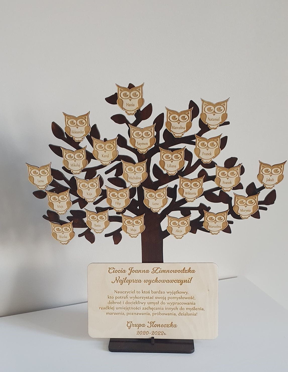 Na drzewku znajdują się małe, urocze sówki, z których każda ma wygrawerowane imię jednego z uczniów. Ta osobista i szczególna cecha sprawia, że drzewko staje się jeszcze bardziej wyjątkowe. Imiona uczniów, które są umieszczone na sówkach, są wyrazem podziękowania i docenienia dla nauczyciela za ich pracę i wpływ na życie uczniów.