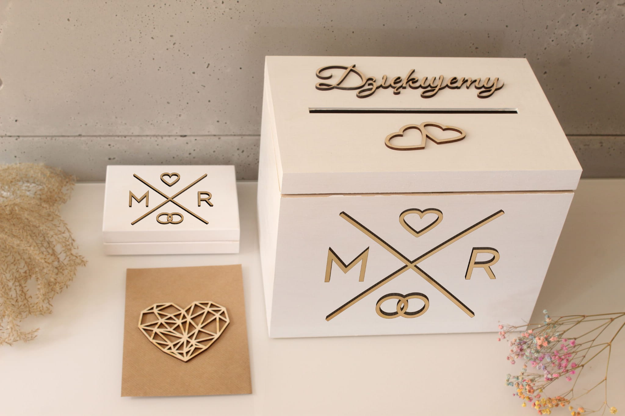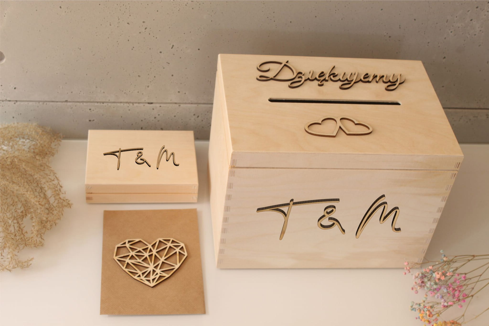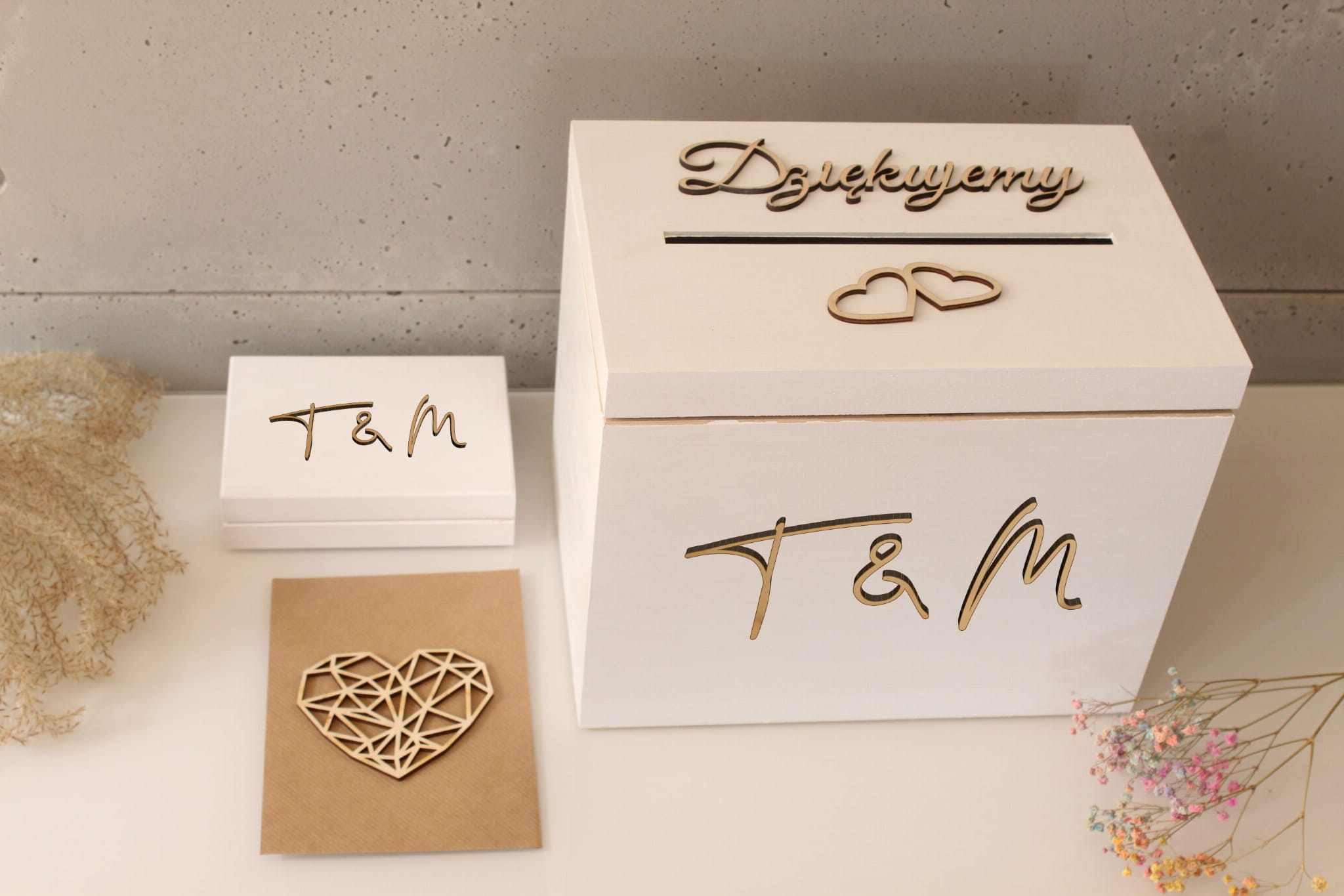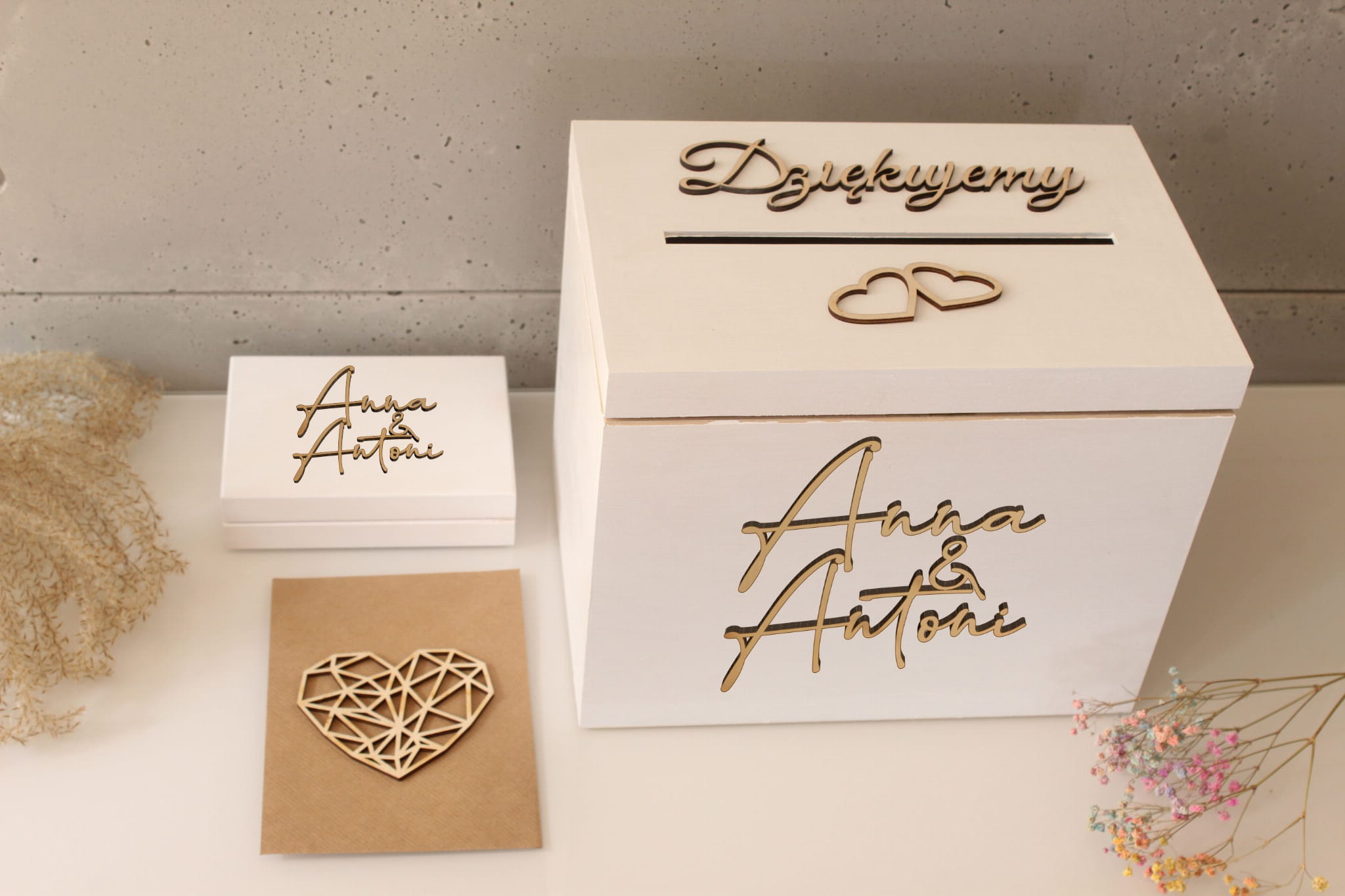 Komplet - drewniane pudełko na koperty i obrączki ślubne + personalizacja GRATIS