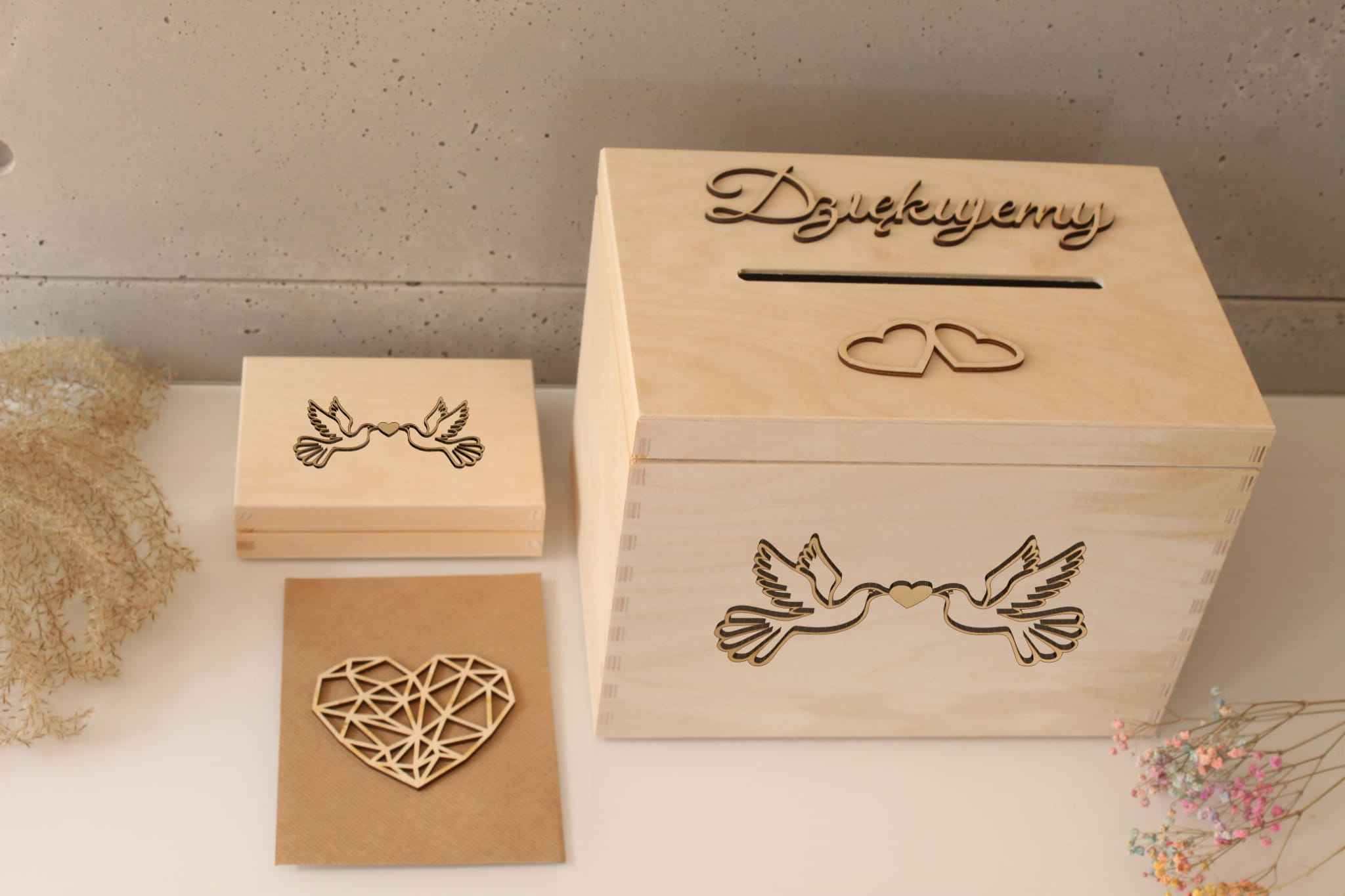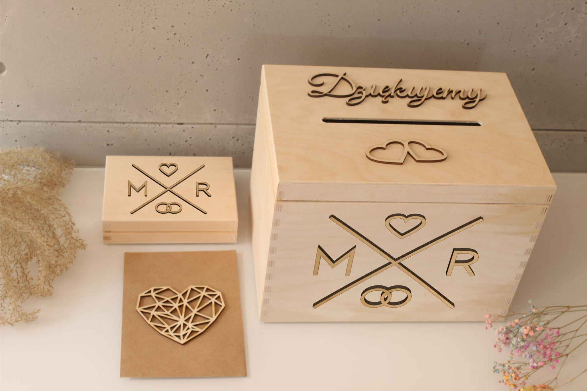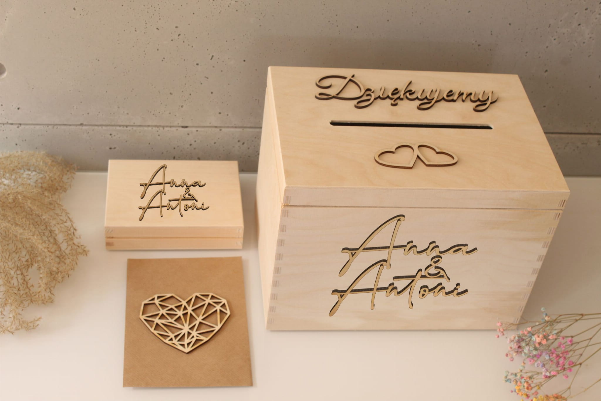 Komplet - drewniane pudełko na koperty i obrączki ślubne + personalizacja GRATIS