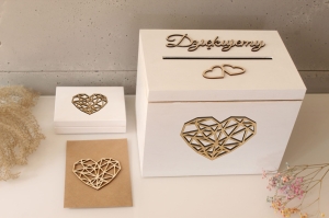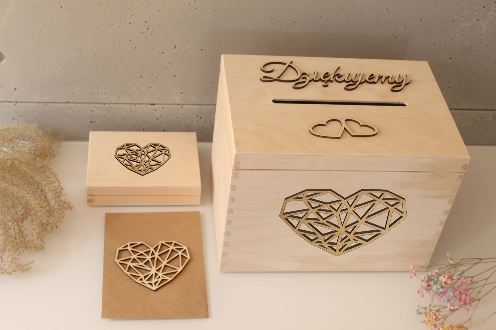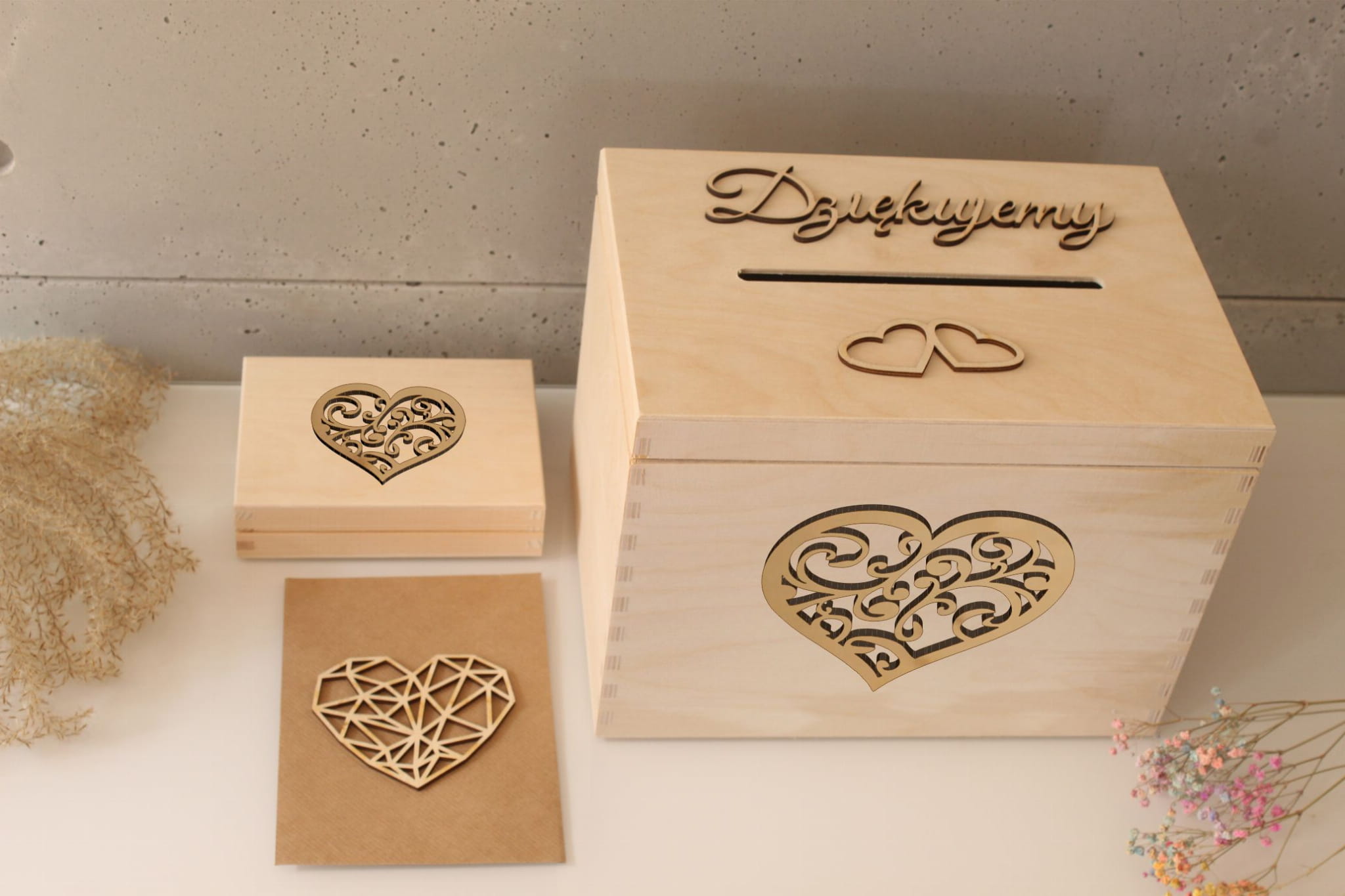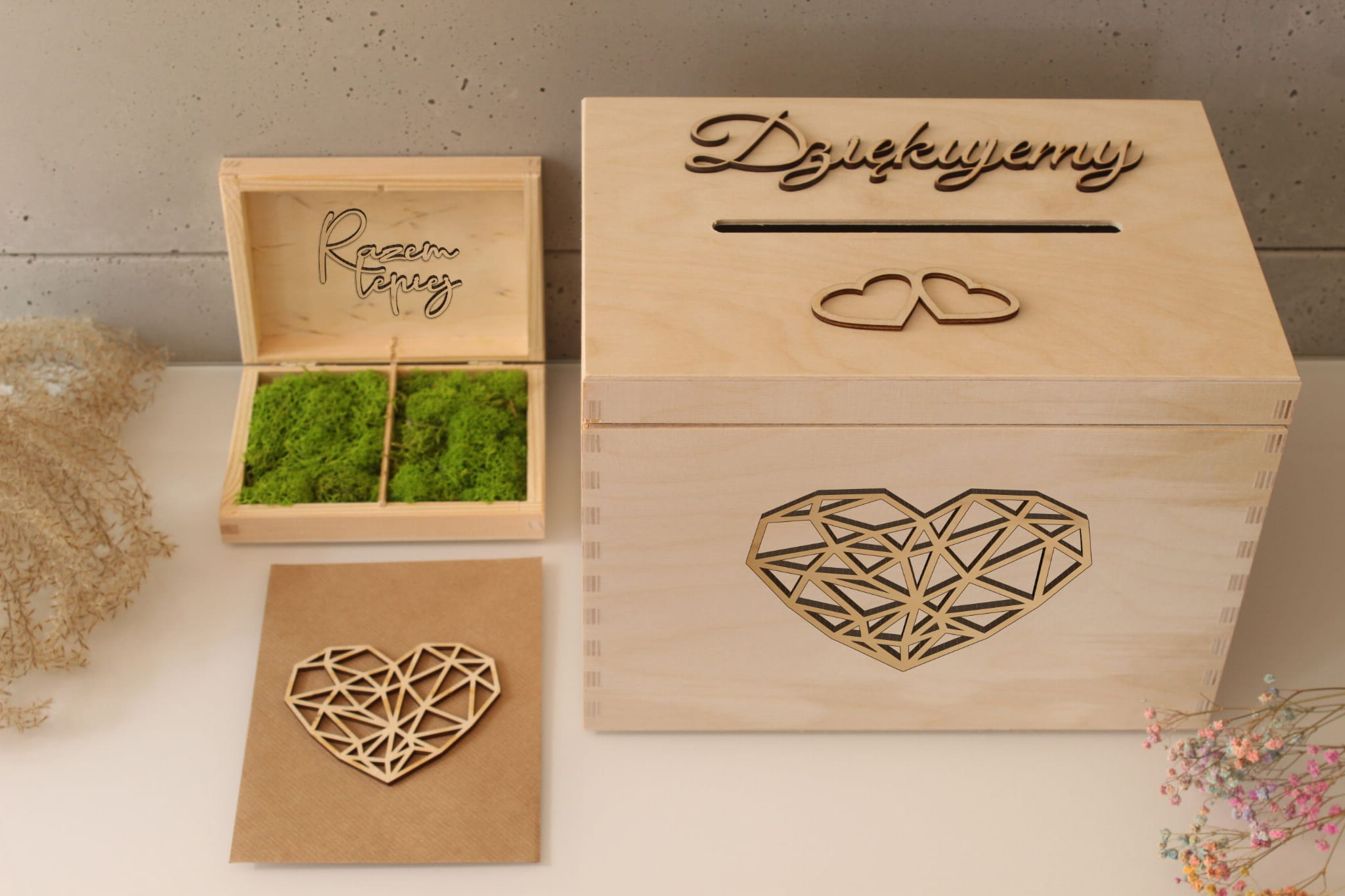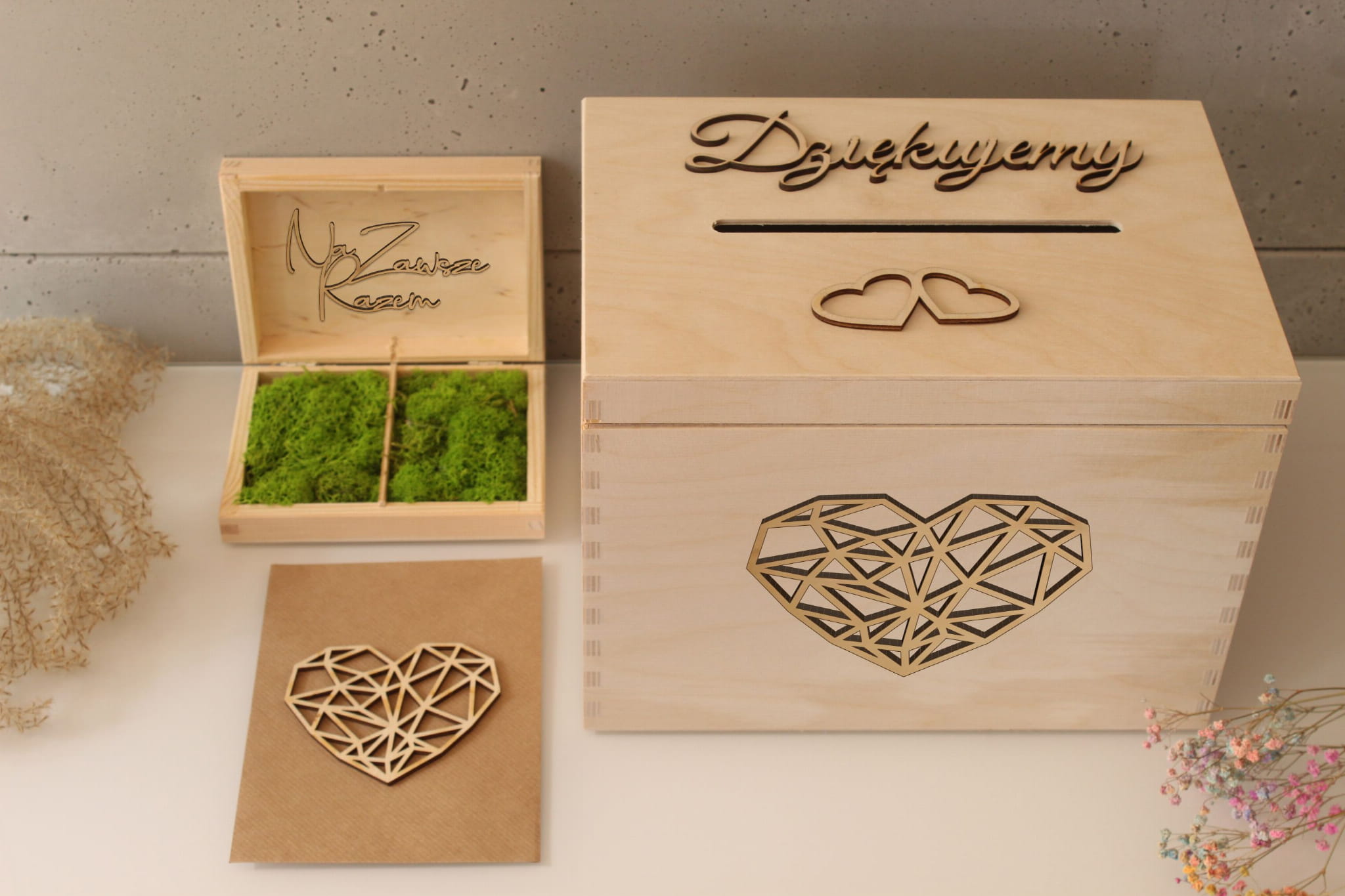 Komplet - drewniane pudełko na koperty i obrączki ślubne + personalizacja GRATIS