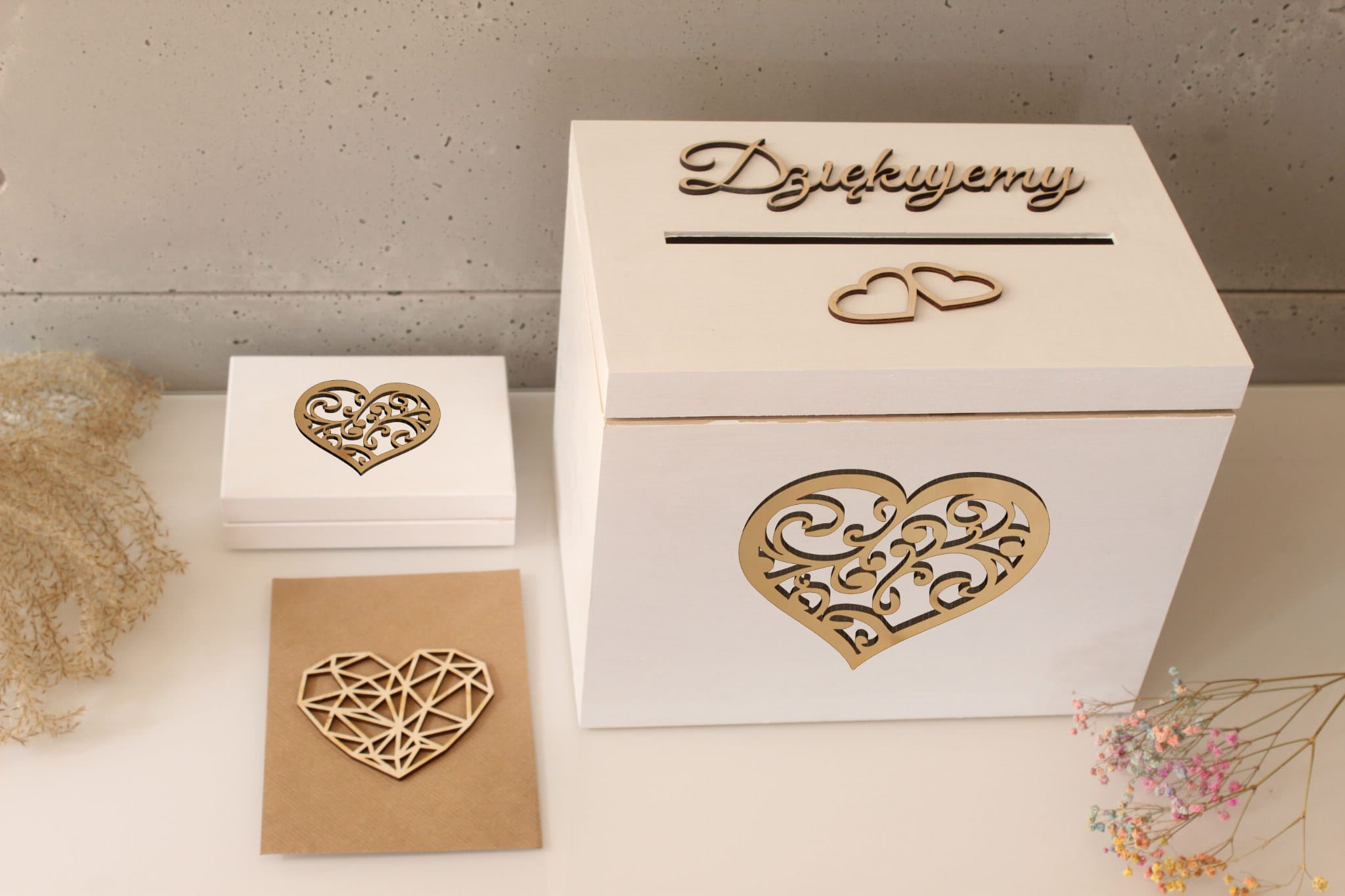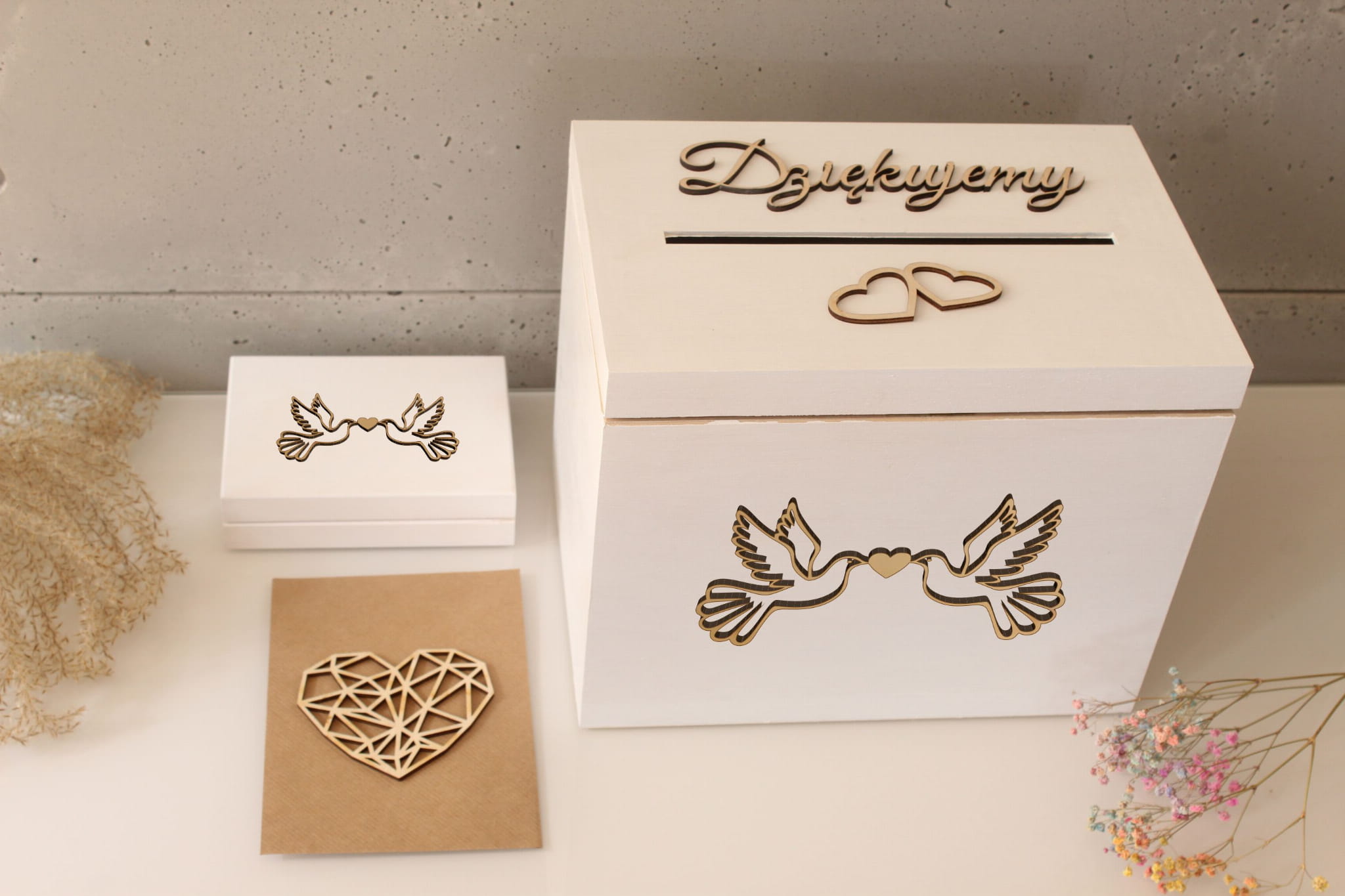 Klienci mogą wybierać spośród dwóch kolorów materiału, które pasują zarówno do tradycyjnych, jak i nowoczesnych motywów ślubnych. Naturalne drewno podkreśla autentyczność i ciepło, nadając pudełkom rustykalny urok. Z kolei biel dodaje im elegancji i doskonale komponuje się z minimalistycznymi, romantycznymi stylami.