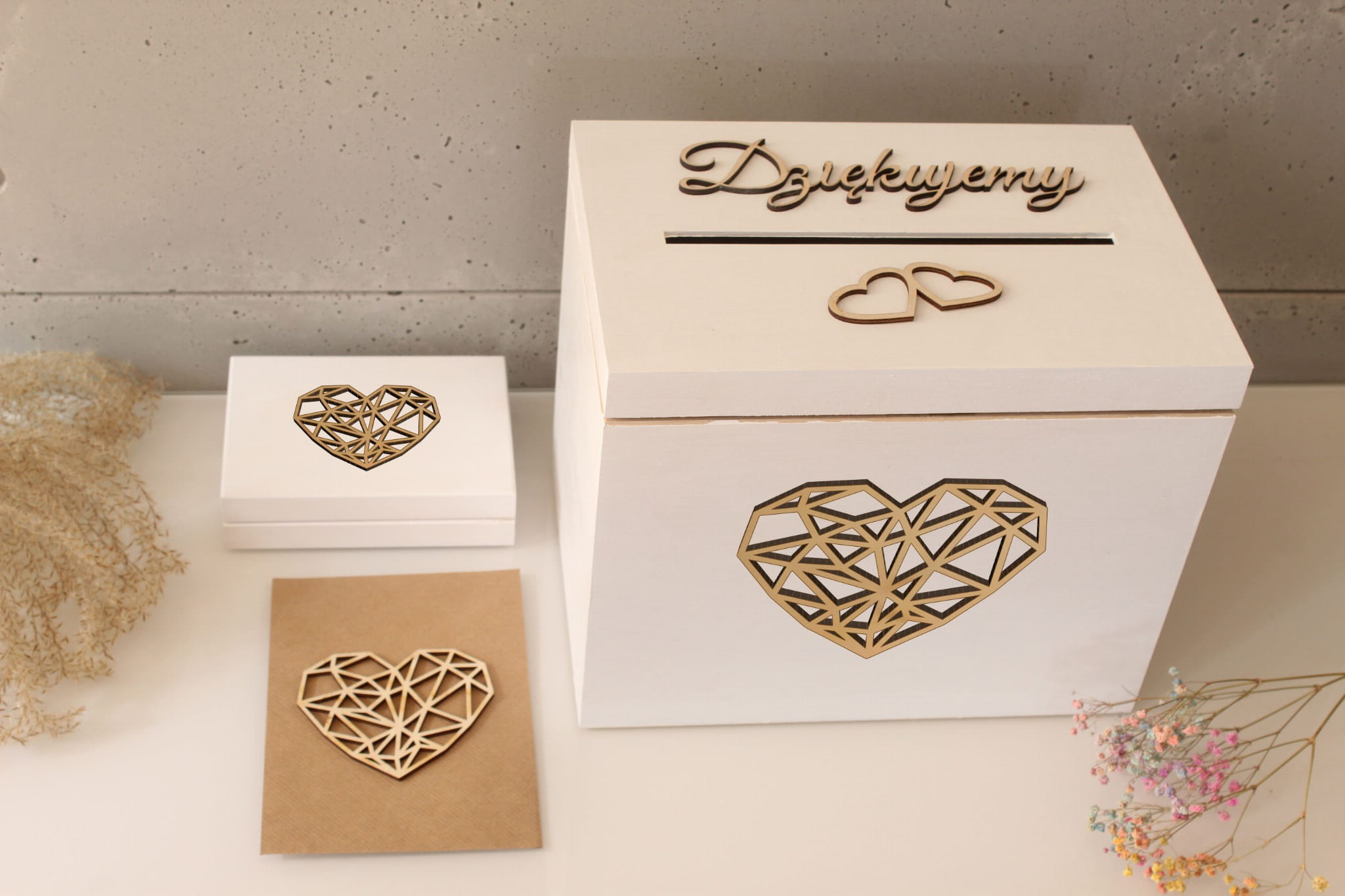 Pudełko na koperty zostało starannie zaprojektowane, aby pomieścić koperty z życzeniami od gości. Jego przestronne wnętrze zapewnia wystarczającą pojemność na różnorodne wielkości kopert, a równocześnie chroni zawartość przed uszkodzeniem czy zagubieniem. Pudełko posiada estetyczne wykończenie i dostęp do wnętrza odbywa się za pomocą delikatnie wyprofilowanego wieczka, które gwarantuje łatwe otwieranie i zamykanie.