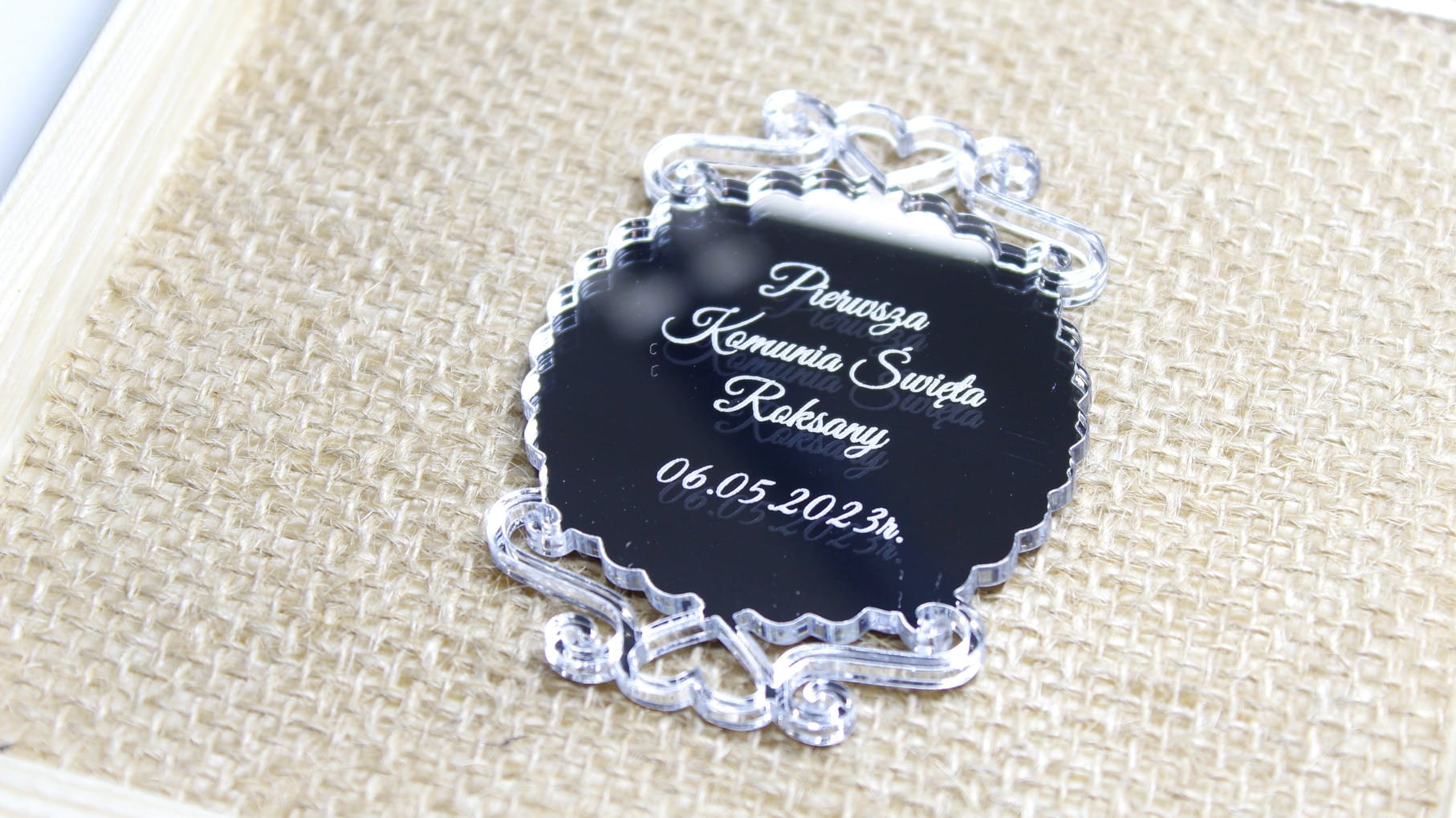 Magnes ze srebrnej pleksy pamiątka Komunii Świętej