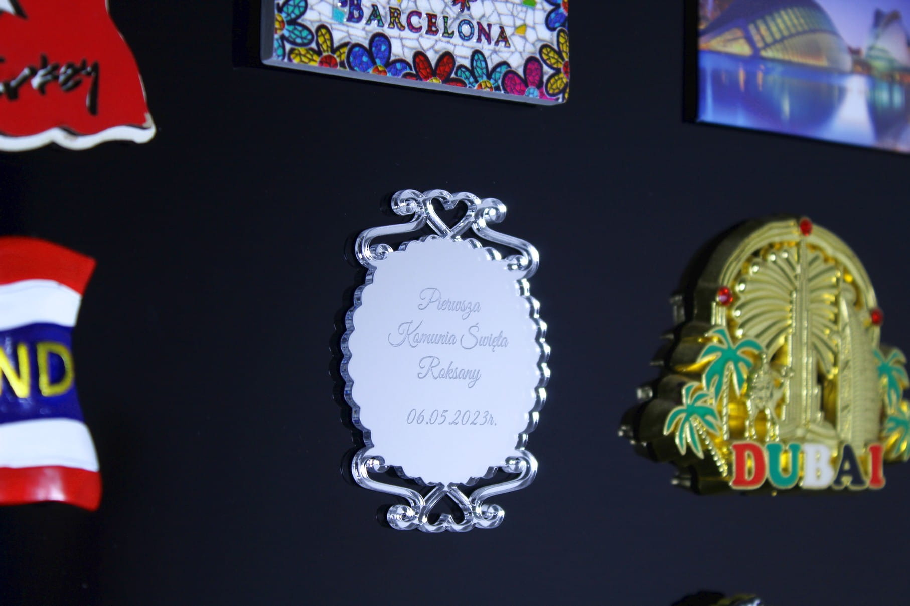 Magnes to wyjątkowy produkt, może służyć jako wspaniała pamiątka dla gości, którzy wzięli udział w tak ważnym dla dziecka wydarzeniu jakim jest Pierwsza Komunia Święta. Wykonany ze srebrnej pleksy magnes, to nie tylko funkcjonalna ozdoba na lodówkę czy inną metalową powierzchnię, ale również piękna dekoracja, która przypomni każdemu z gości o wspólnie spędzonym czasie.