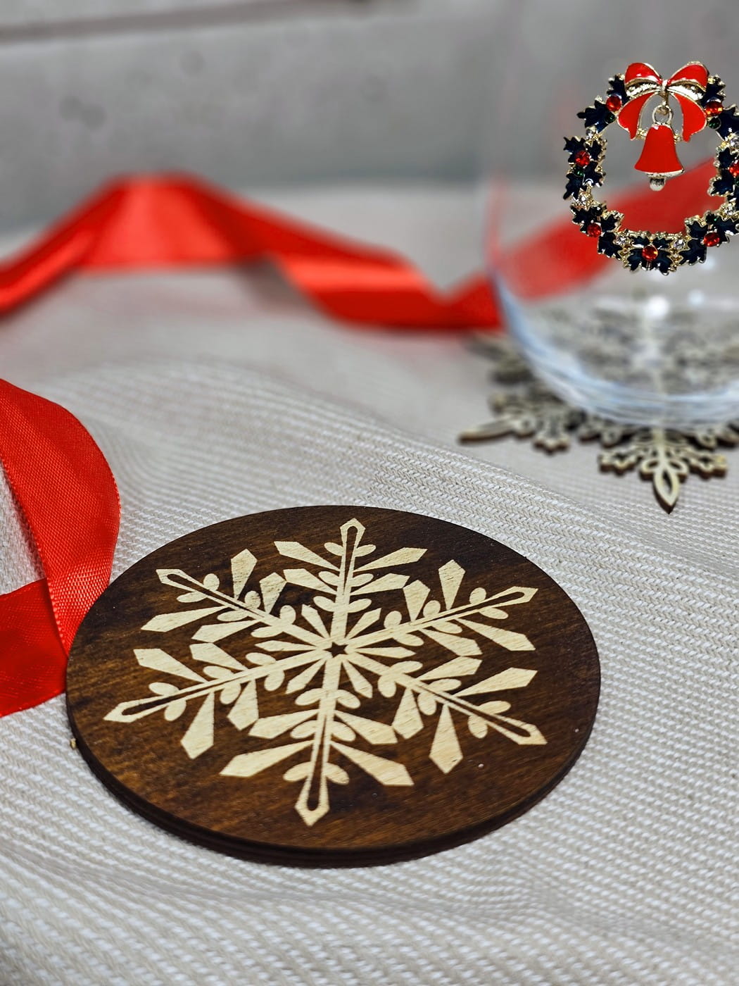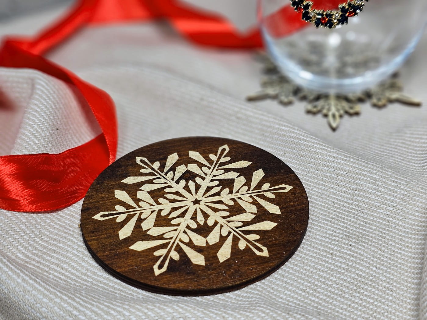 Świąteczna podkładka pod kubek w kształcie śnieżynki prezentuje się wprost przepięknie. Do wyboru aż 9 wzorów! Okrągła podstawka z grawerem spisze się również jako upominki świąteczne dla firm.