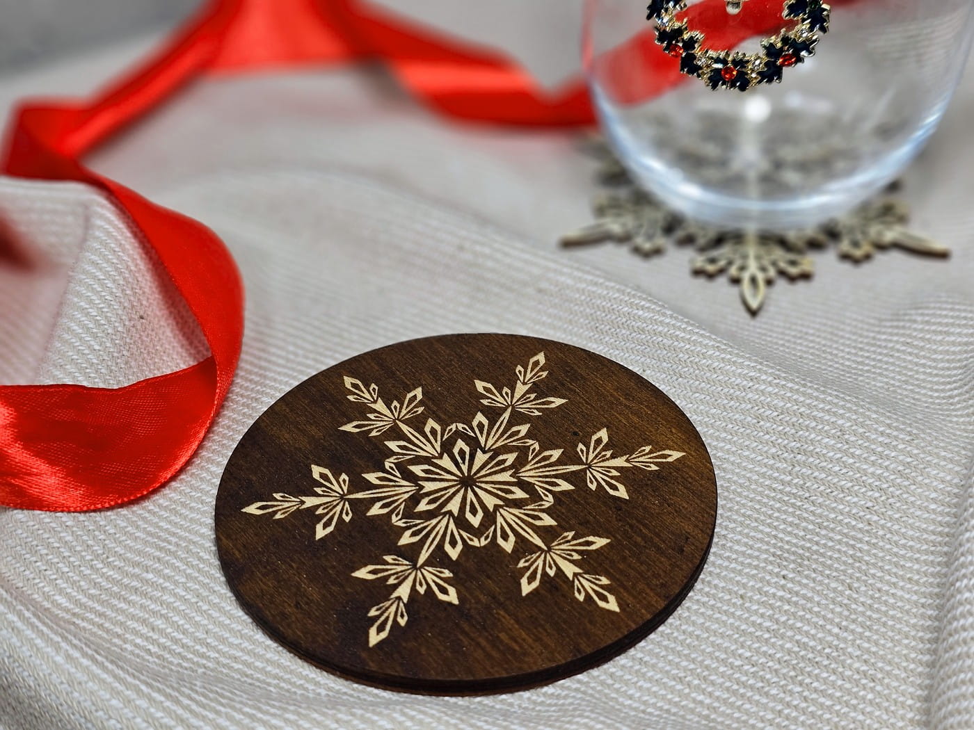 Świąteczna podkładka pod kubek w kształcie śnieżynki prezentuje się wprost przepięknie. Do wyboru aż 9 wzorów! Okrągła podstawka z grawerem spisze się również jako upominki świąteczne dla firm.