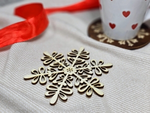 Podkładka pod gorący napój w kształcie śnieżynki ozdobi stół podczas spotkania rodzinnego. Nadaje elegancji i ciepła, z powodzeniem sprawdzi się jako ozdoba bożonarodzeniowa lub drobny upominek dla bliskich.