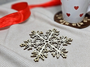 Podkładka pod gorący napój w kształcie śnieżynki ozdobi stół podczas spotkania rodzinnego. Nadaje elegancji i ciepła, z powodzeniem sprawdzi się jako ozdoba bożonarodzeniowa lub drobny upominek dla bliskich.