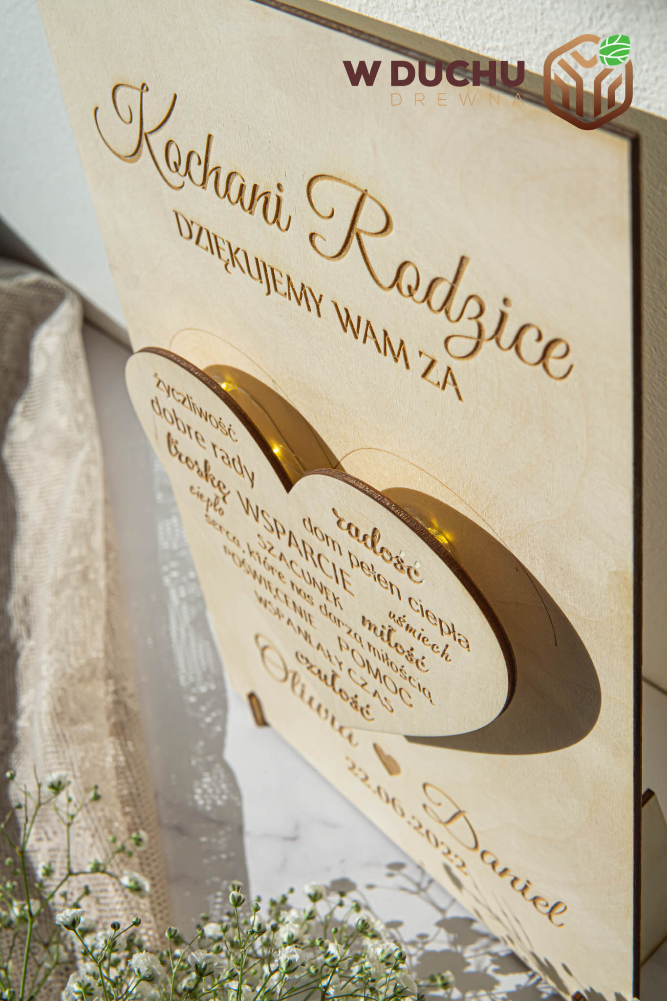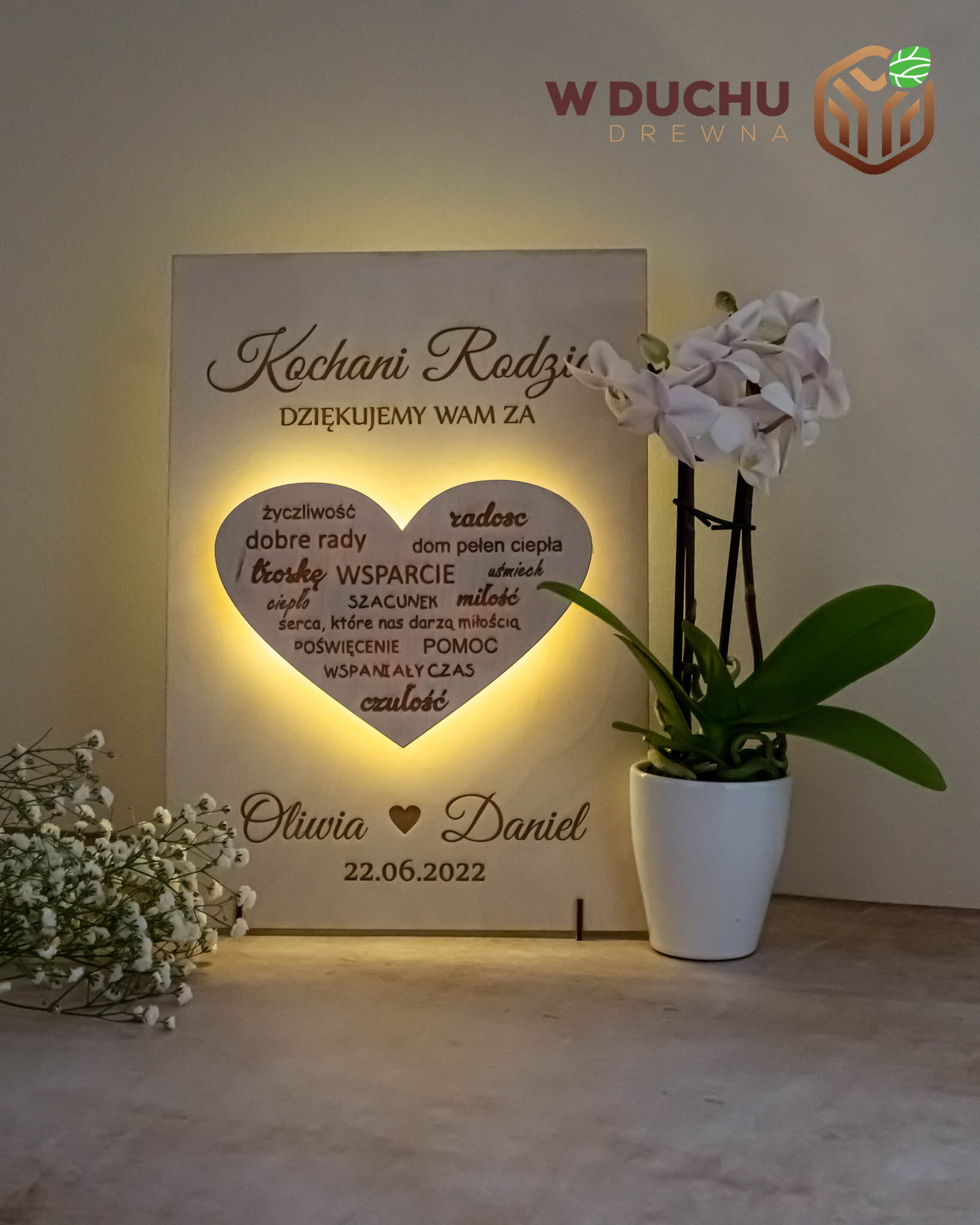 Ta drewniana tabliczka z podświetlanym serduszkiem to idealny prezent dla Waszych rodziców za trud włożony w ich wychowanie. Tabliczka ma nietuzinkowy wygląd dzięki podświetlanemu serduszku, na którym wygrawerowane są podziękowania dla Waszych bliskich.