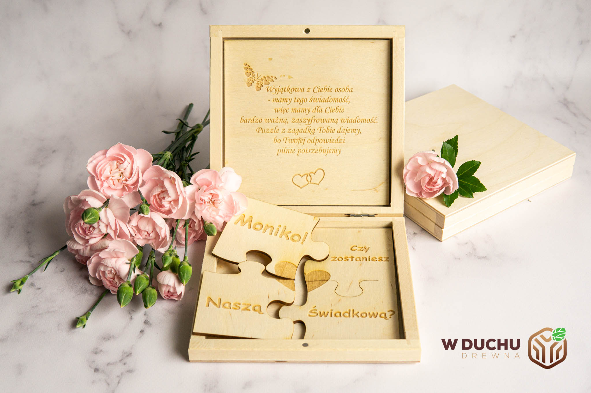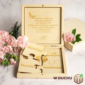 Ta oryginalna prośba o świadkowanie to nie tylko sposób na poproszenie wybranej osoby o wypełnienie ważnej roli podczas Twojego ślubu, ale również piękna pamiątka z tego wyjątkowego dnia. Zamiast tradycyjnych zaproszeń, możesz zaskoczyć swoich bliskich drewnianymi puzzlami, składającymi się z 4 elementów, które złożone w całość tworzą prośbę o bycie Twoim świadkiem. Drewniane puzzle wykonane ze sklejki o grubości 3 mm zapakowane są w urocze, drewniane pudełko, co dodaje temu produktowi niepowtarzalnego wyglądu i charakteru. Puzzle na pewno wywołają uśmiech na twarzy bliskiej Ci osoby. Po rozwiązaniu puzzli, odbiorca odkryje Twoją szczególną prośbę i na pewno zrobi to z wielką przyjemnością. To oryginalne i piękne rozwiązanie, które z pewnością zostanie docenione przez Twoich bliskich i stanie się piękną pamiątką z tego wyjątkowego dnia.