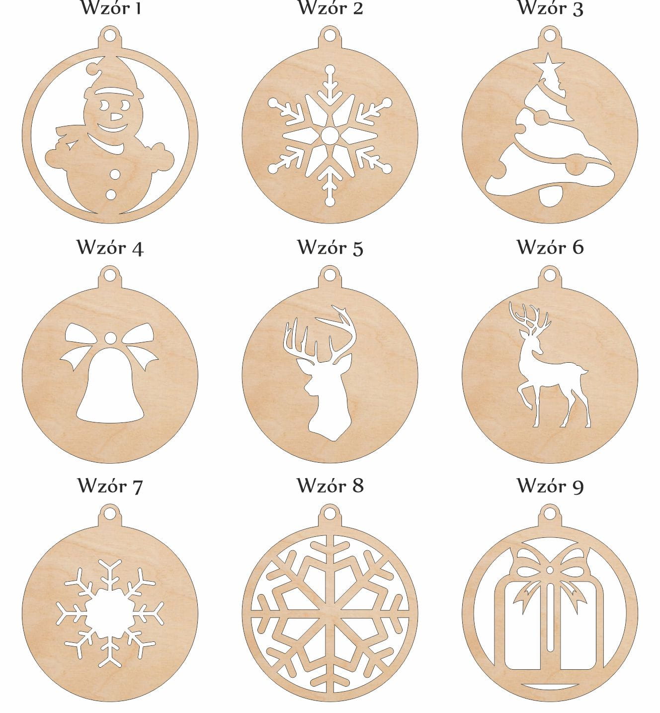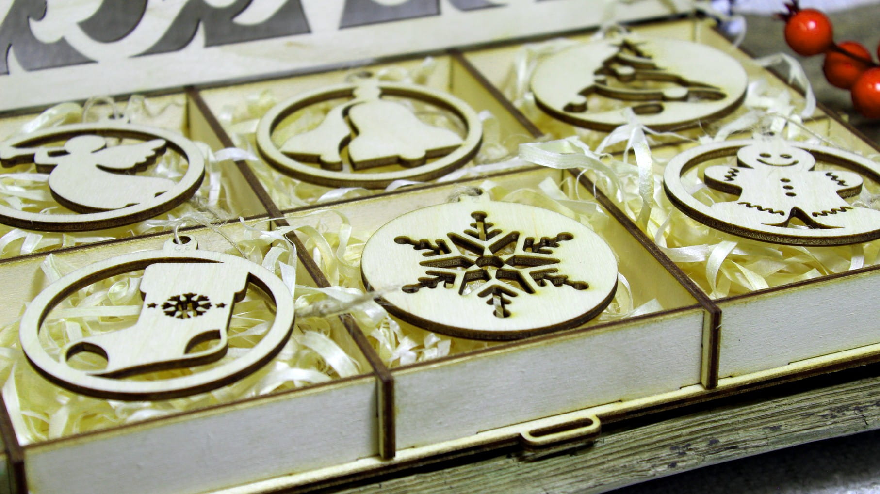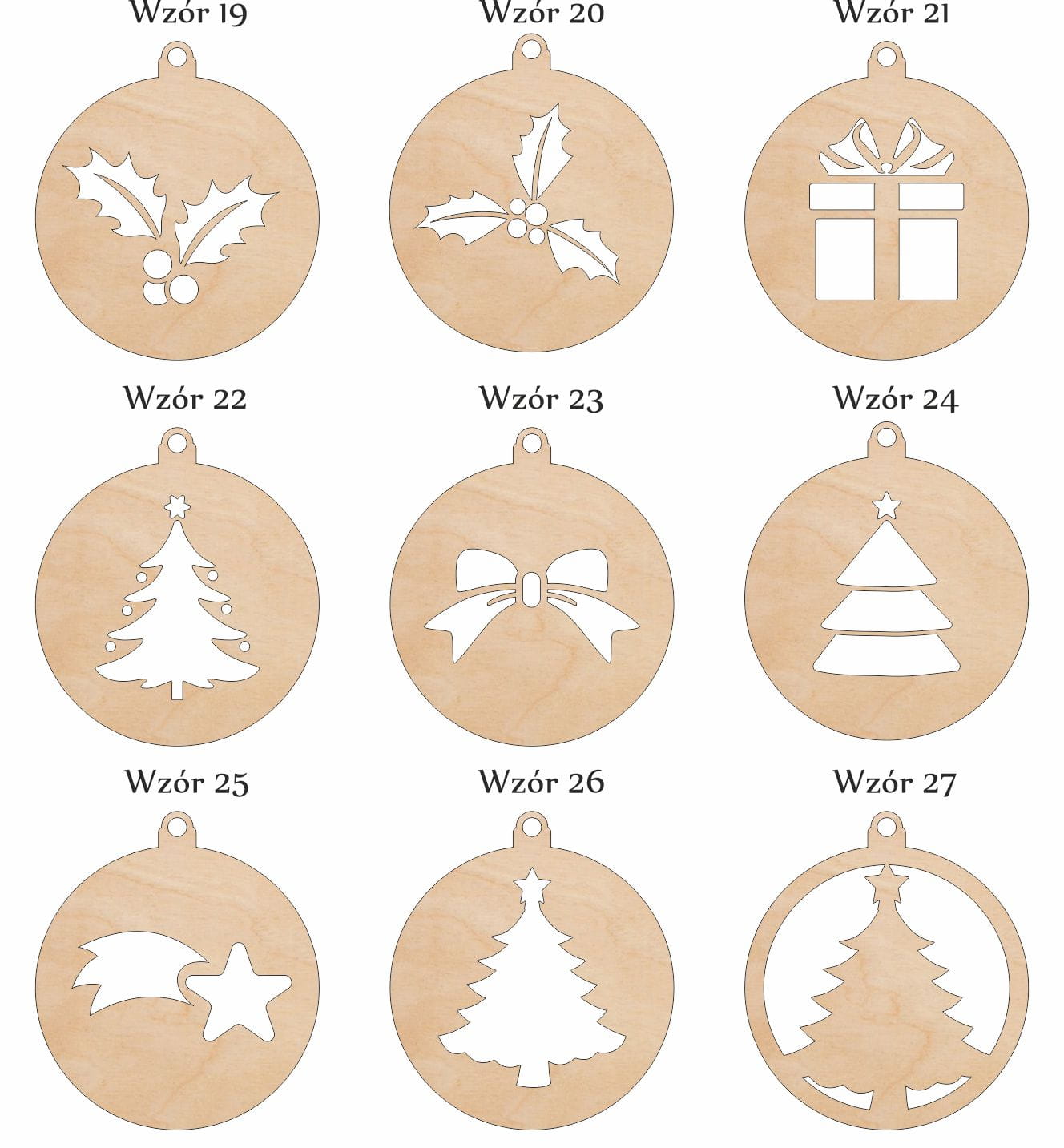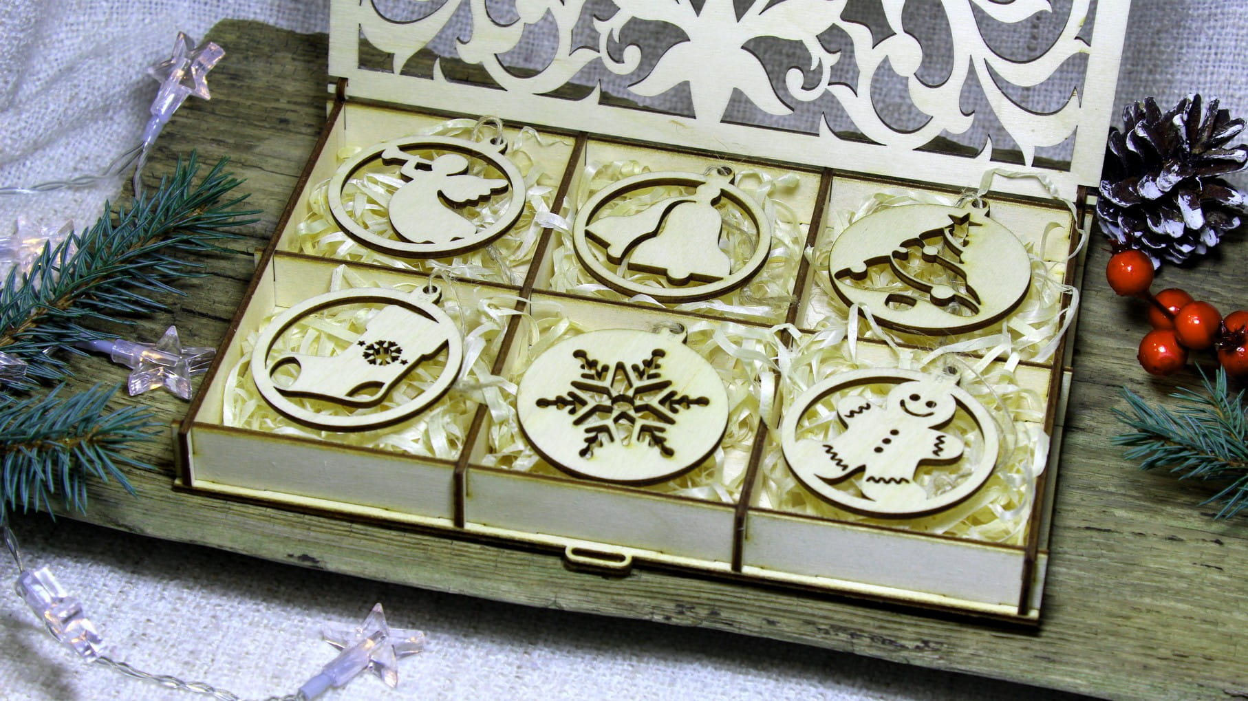 Pudełko oraz 12 bombek wykonane są z jasnego brzozowego drewna. Pudełko jest w pełni naturalne, przy składaniu nie użyto kleju.