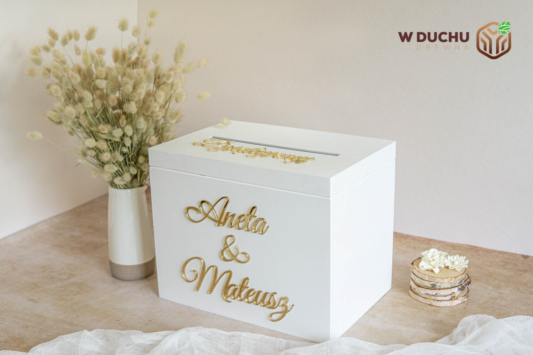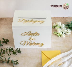 Personalizowane pudełko na koperty z napisem lustrzanym wykonane z drzewa sosnowego. Zarówno pomalowane, jak i w naturalnym kolorze wygląda delikatnie. Z racji swoich nieco większych wymiarów (pojemność) idealnie nadaje się na wesela z większą ilością gości.