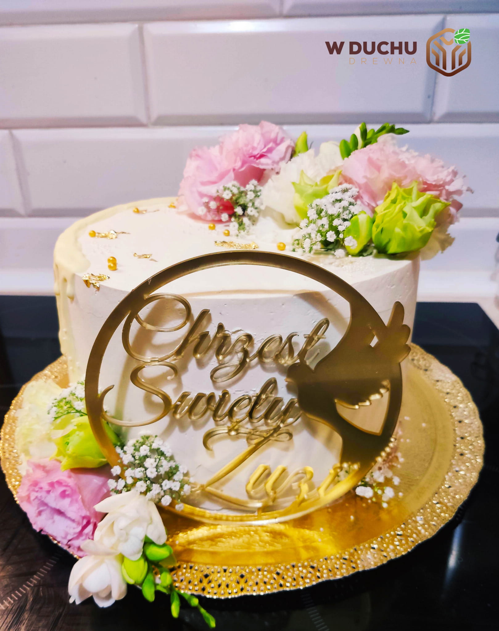 Ten piękny topper można wbijać w tort, co pozwoli na stworzenie kompozycji z dodatkiem świeżych owoców lub postawić obok tortu jako dodatkową dekorację. Lustrzana plexi dodaje elegancji i efektu refleksyjnego, co z pewnością przyciągnie uwagę gości.