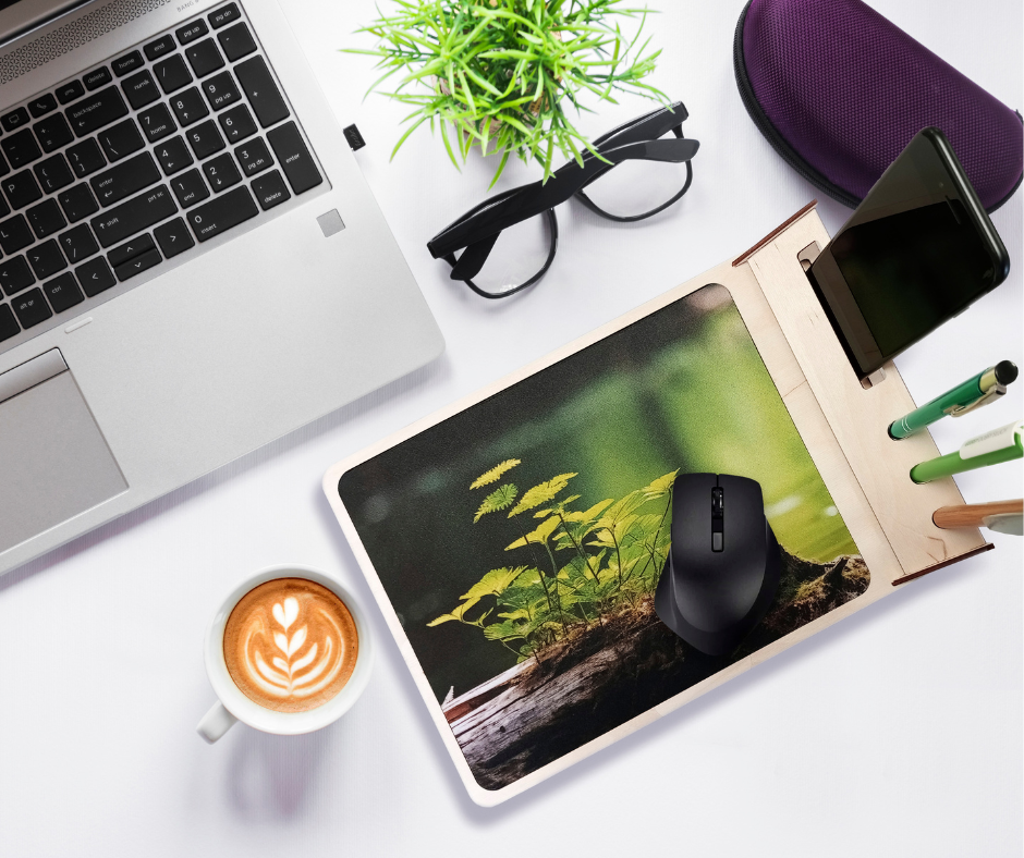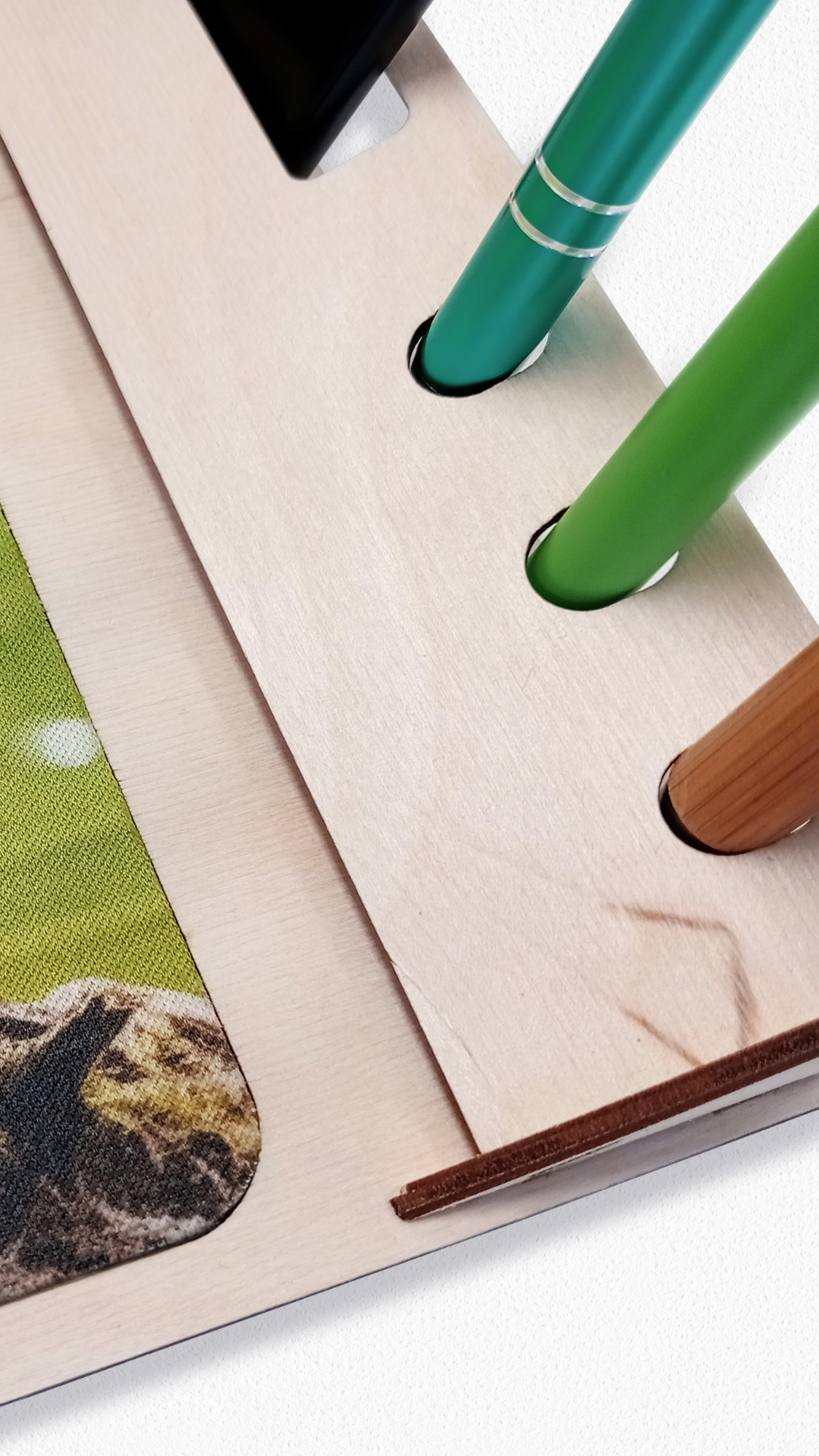 Gadżet biurowy 2W1, czyli drewniana podstawka z miejscem na telefon i długopisy. Totalny must have w biurze, który nie zabiera przestrzeni na biurku i gwarantuje optymalną pracę myszki. Wierzchnia warstwa pozwala na płynne poruszanie się myszką.